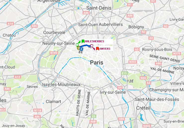 Il n'y a pas de ligne de métro directe entre les stations Malesherbes et Anvers. Le trajet est effectué avec une correspondances entre les lignes