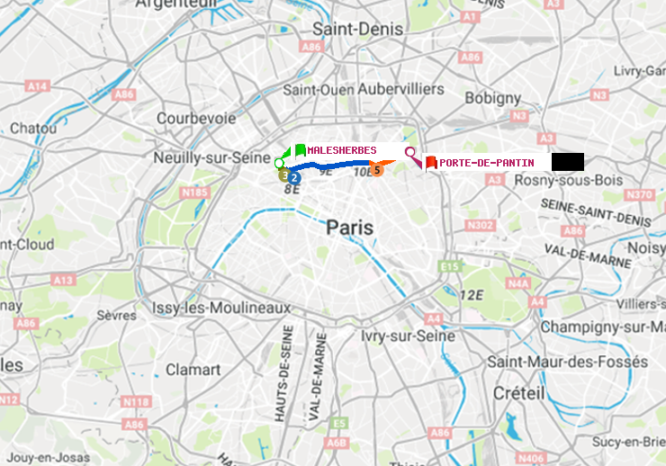 Il n'y a pas de ligne de métro directe entre les stations Malesherbes et Porte de Pantin. Le trajet est effectué en 2 correspondances entre les lignes : ligne