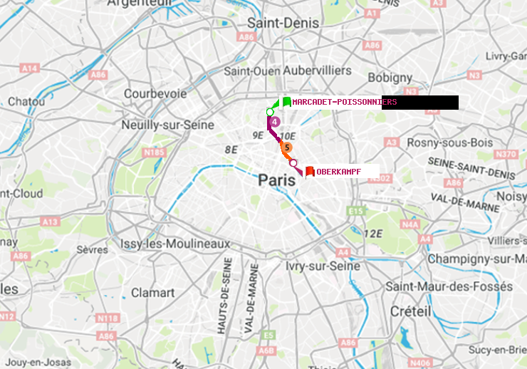 Il n'y a pas de ligne de métro directe entre les stations Marcadet-Poissonniers et Oberkampf. Le trajet est effectué avec une correspondances entre les lignes