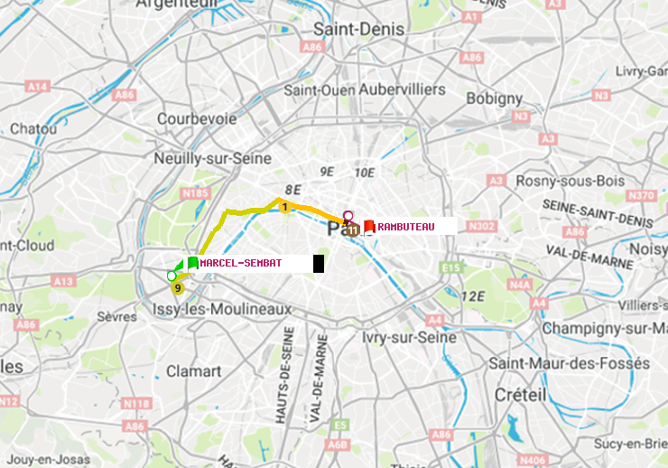 Il n'y a pas de ligne de métro directe entre les stations Marcel Sembat et Rambuteau. Le trajet est effectué en 2 correspondances entre les lignes : ligne