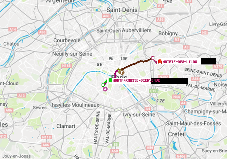 Plan de l'itinéraire métro de Montparnasse-Bienvenue vers Mairie des Lilas