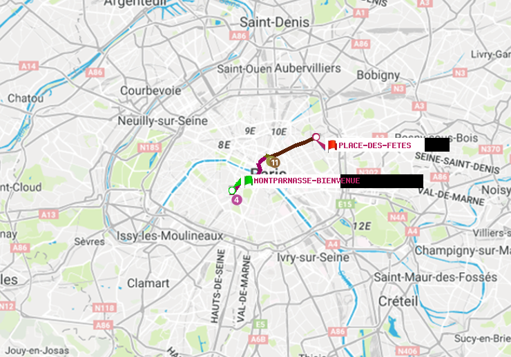 Itinéraire en métro parisien de Montparnasse-Bienvenue vers Place des Fêtes