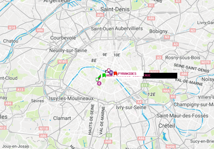 Il n'y a pas de ligne de métro directe entre les stations Montparnasse-Bienvenue et Pyramides. Le trajet est effectué avec une correspondances entre les lignes