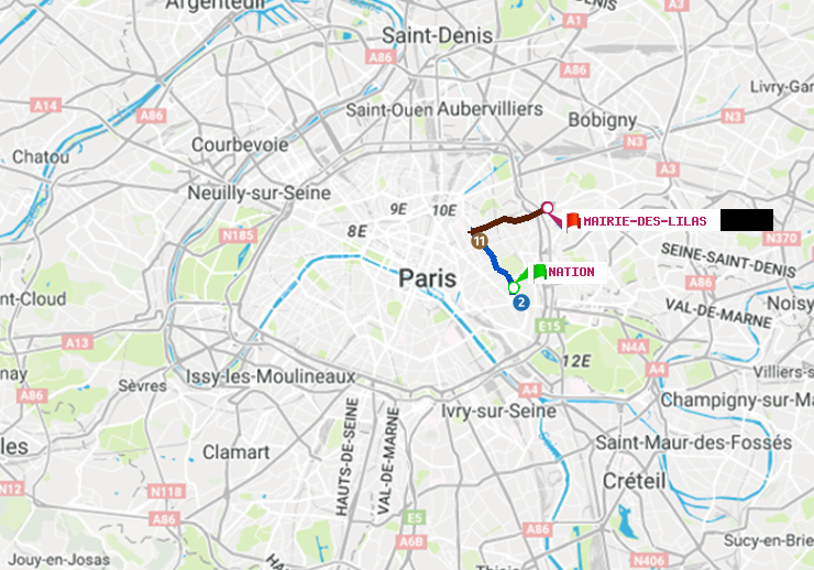 Plan de l'itinéraire métro de Nation vers Mairie des Lilas