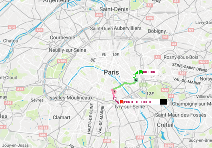 Plan de l'itinéraire métro de Nation vers Porte d'Italie