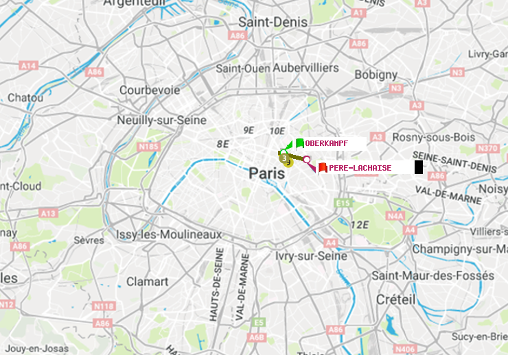 Il n'y a pas de ligne de métro directe entre les stations Oberkampf et Père-Lachaise. Le trajet est effectué avec une correspondances entre les lignes