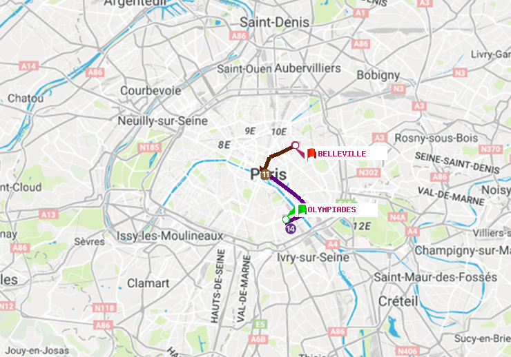 Il n'y a pas de ligne de métro directe entre les stations Olympiades et Belleville. Le trajet est effectué avec une correspondances entre les lignes