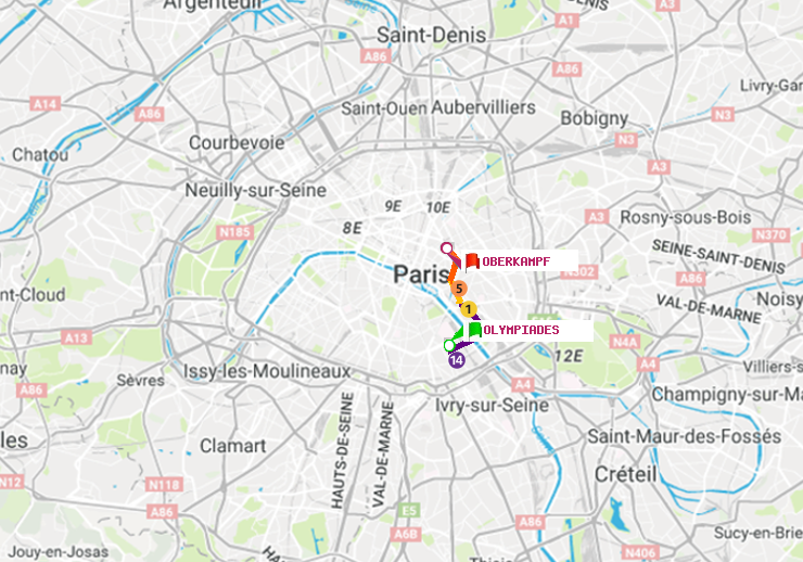 Il n'y a pas de ligne de métro directe entre les stations Olympiades et Oberkampf. Le trajet est effectué en 2 correspondances entre les lignes : ligne