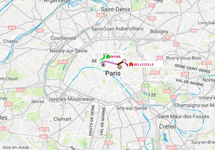Il n'y a pas de ligne de métro directe entre les stations Opéra et Belleville. Le trajet est effectué avec une correspondances entre les lignes