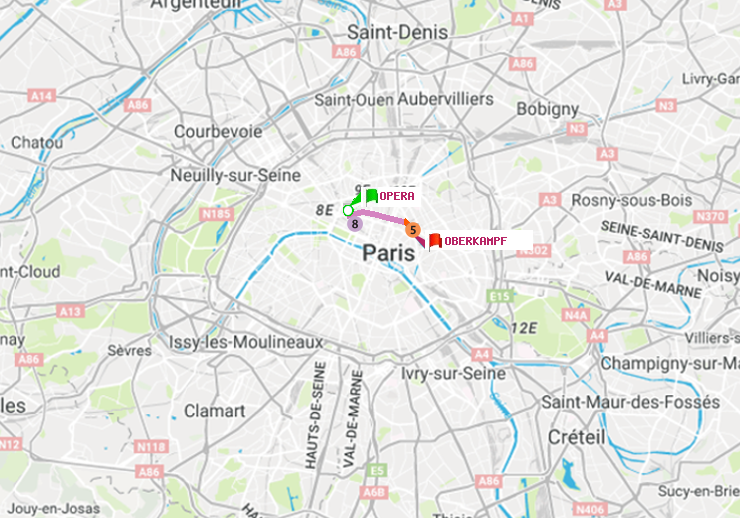 Il n'y a pas de ligne de métro directe entre les stations Opéra et Oberkampf. Le trajet est effectué avec une correspondances entre les lignes