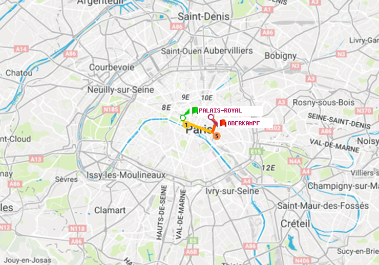 Il n'y a pas de ligne de métro directe entre les stations Palais-Royal (Musée du Louvre) et Oberkampf. Le trajet est effectué avec une correspondances entre les lignes