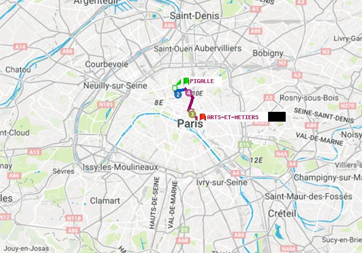 Plan de l'itinéraire métro de Pigalle vers Arts-et-Métiers