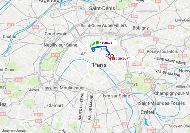 Il n'y a pas de ligne de métro directe entre les stations Pigalle et Goncourt (Hôpital Saint-Louis). Le trajet est effectué avec une correspondances entre les lignes