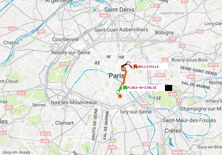 Plan de l'itinéraire métro de Place d'Italie vers Belleville