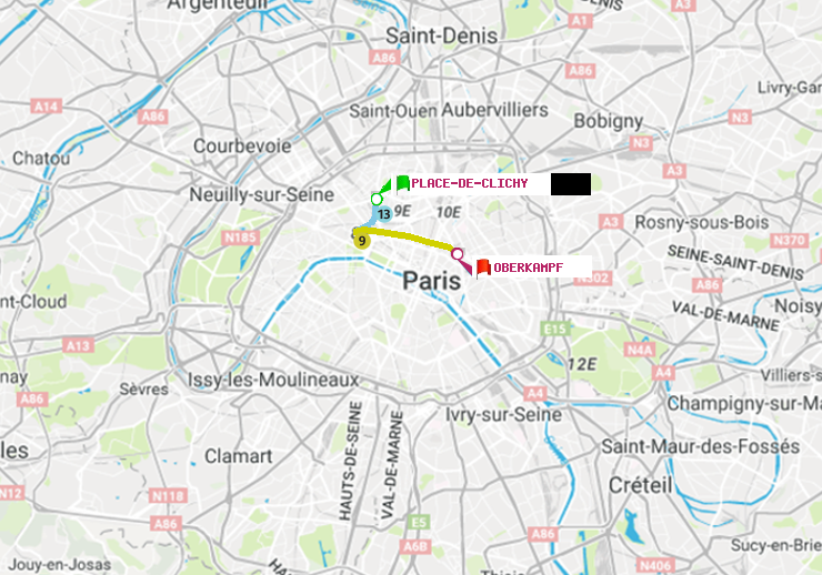 Il n'y a pas de ligne de métro directe entre les stations Place de Clichy et Oberkampf. Le trajet est effectué avec une correspondances entre les lignes
