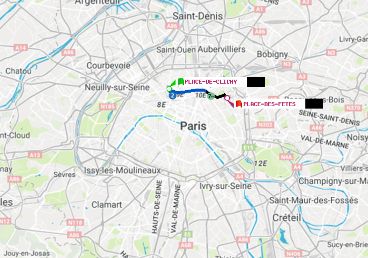 Il n'y a pas de ligne de métro directe entre les stations Place de Clichy et Place des Fêtes. Le trajet est effectué avec une correspondances entre les lignes