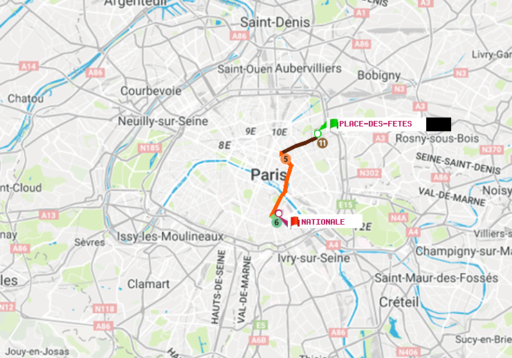 Il n'y a pas de ligne de métro directe entre les stations Place des Fêtes et Nationale. Le trajet est effectué en 2 correspondances entre les lignes : ligne