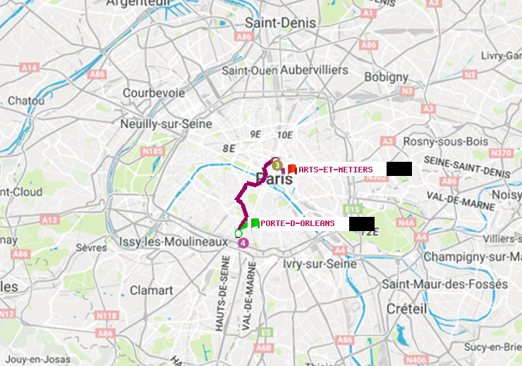 A : Porte d'Orléans (Général Leclerc) | B : Arts-et-Métiers