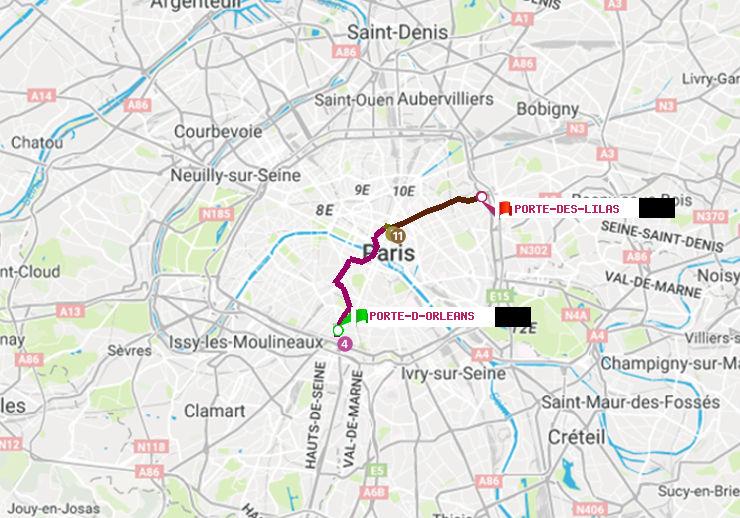Il n'y a pas de ligne de métro directe entre les stations Porte d'Orléans (Général Leclerc) et Porte des Lilas. Le trajet est effectué en 3 correspondances entre les lignes : ligne