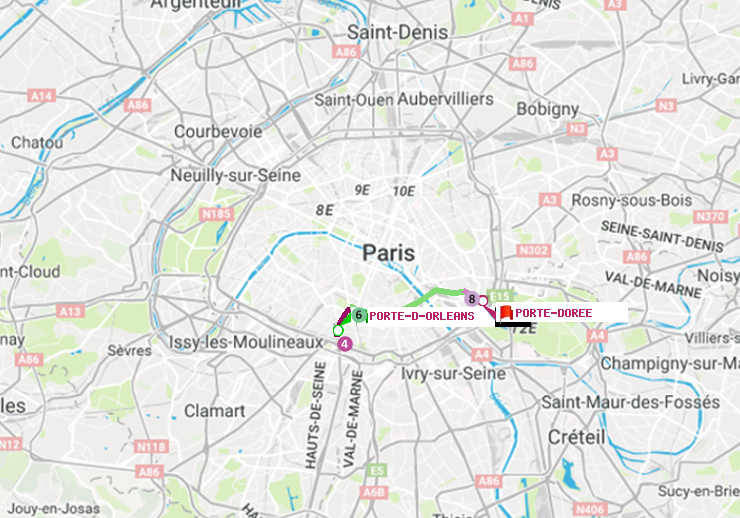 Il n'y a pas de ligne de métro directe entre les stations Porte d'Orléans (Général Leclerc) et Porte Dorée. Le trajet est effectué en 3 correspondances entre les lignes : ligne