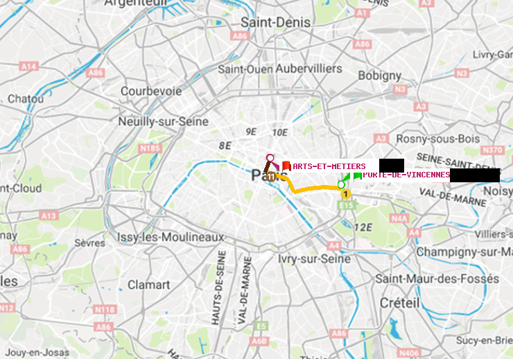 Il n'y a pas de ligne de métro directe entre les stations Porte de Vincennes et Arts-et-Métiers. Le trajet est effectué avec une correspondances entre les lignes