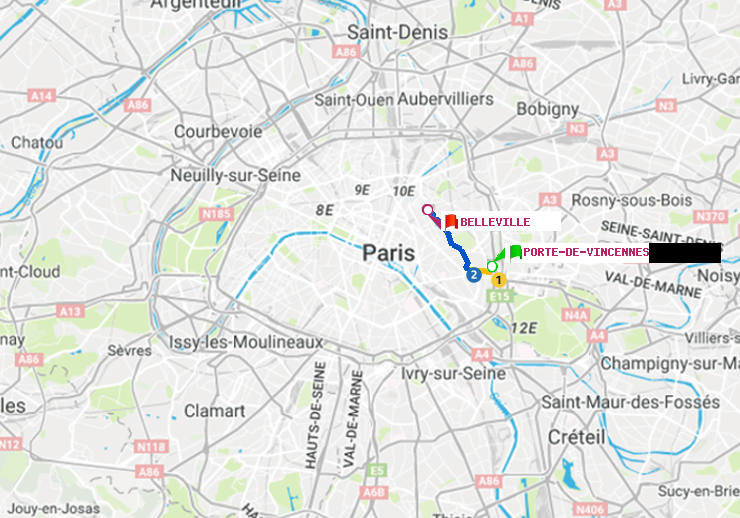Il n'y a pas de ligne de métro directe entre les stations Porte de Vincennes et Belleville. Le trajet est effectué avec une correspondances entre les lignes