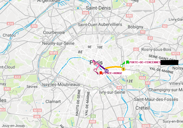Il n'y a pas de ligne de métro directe entre les stations Porte de Vincennes et Place Monge (Jardin des Plantes). Le trajet est effectué en 2 correspondances entre les lignes : ligne