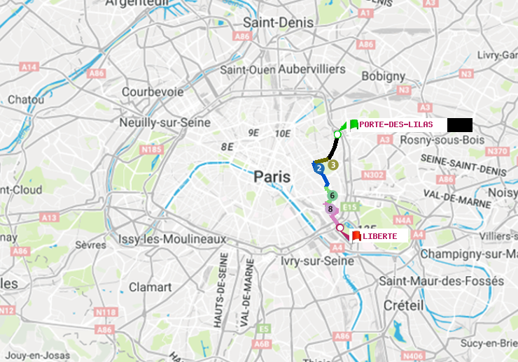 Il n'y a pas de ligne de métro directe entre les stations Porte des Lilas et Liberté. Le trajet est effectué en 4 correspondances entre les lignes : ligne