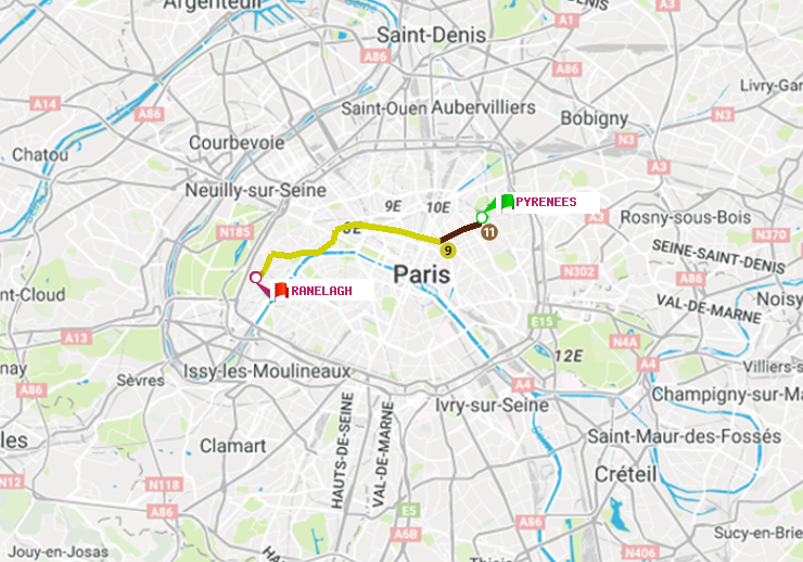 Il n'y a pas de ligne de métro directe entre les stations Pyrenees et Ranelagh. Le trajet est effectué avec une correspondances entre les lignes