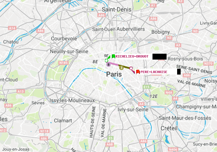 Il n'y a pas de ligne de métro directe entre les stations Richelieu-Drouot et Père-Lachaise. Le trajet est effectué avec une correspondances entre les lignes