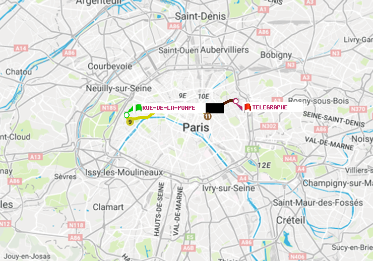Il n'y a pas de ligne de métro directe entre les stations Rue de la Pompe (Avenue Georges Mandel) et Telegraphe. Le trajet est effectué avec une correspondances entre les lignes