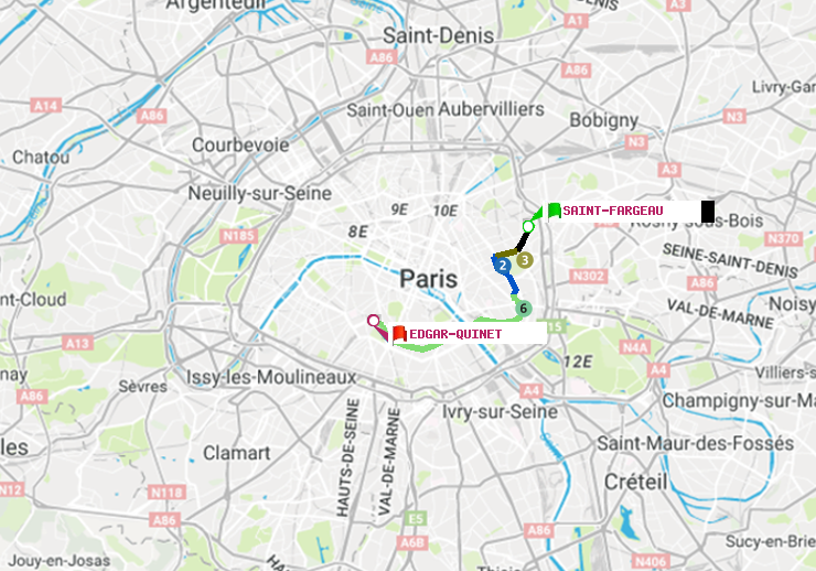 Il n'y a pas de ligne de métro directe entre les stations Saint-Fargeau et Edgar-Quinet. Le trajet est effectué en 3 correspondances entre les lignes : ligne