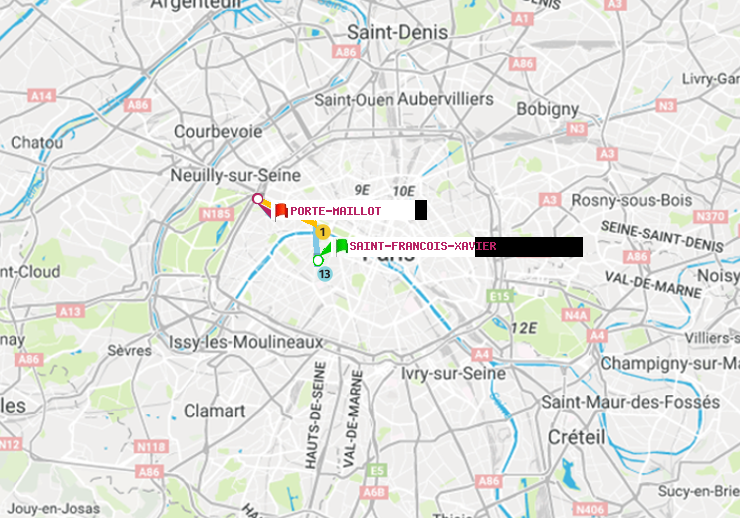 Il n'y a pas de ligne de métro directe entre les stations Saint-Francois-Xavier et Porte Maillot. Le trajet est effectué avec une correspondances entre les lignes