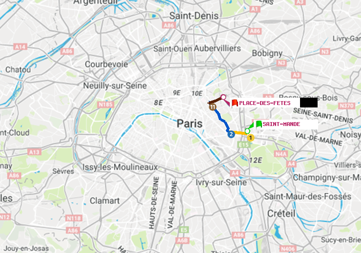 Il n'y a pas de ligne de métro directe entre les stations Saint-Mandé et Place des Fêtes. Le trajet est effectué en 2 correspondances entre les lignes : ligne