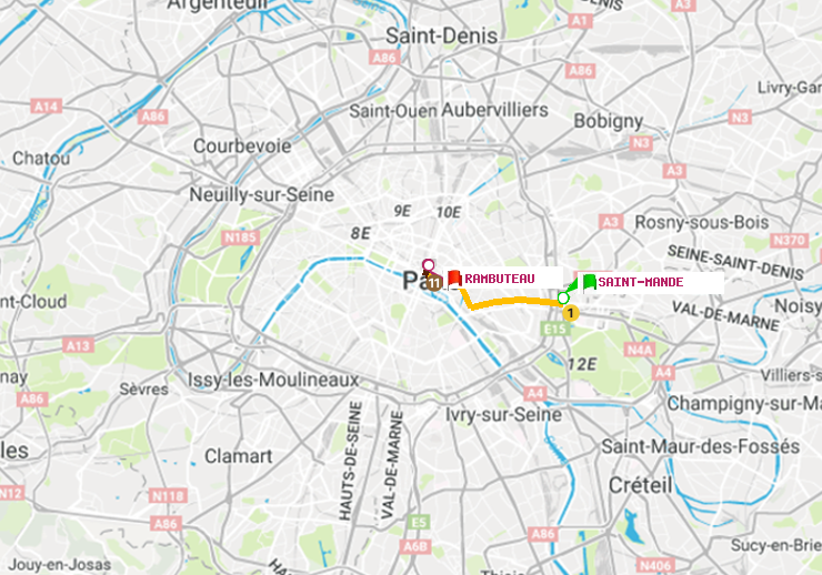 Il n'y a pas de ligne de métro directe entre les stations Saint-Mandé et Rambuteau. Le trajet est effectué avec une correspondances entre les lignes