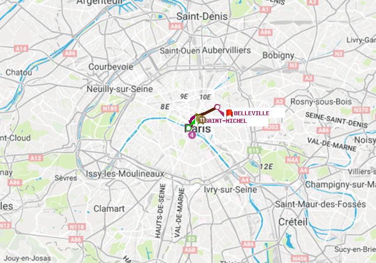Plan de l'itinéraire métro de Saint-Michel vers Belleville