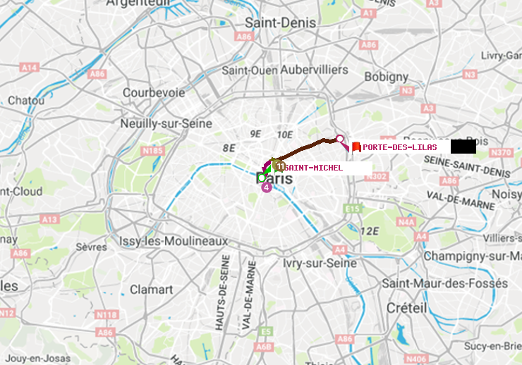 Itinéraire en métro parisien de Saint-Michel vers Porte des Lilas