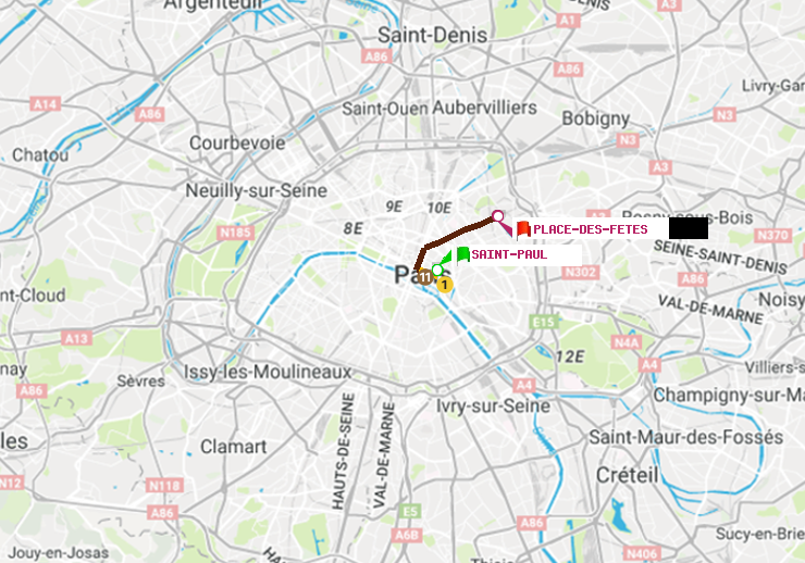 Il n'y a pas de ligne de métro directe entre les stations Saint-Paul (Le Marais) et Place des Fêtes. Le trajet est effectué avec une correspondances entre les lignes