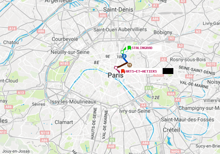 Il n'y a pas de ligne de métro directe entre les stations Stalingrad et Arts-et-Métiers. Le trajet est effectué avec une correspondances entre les lignes