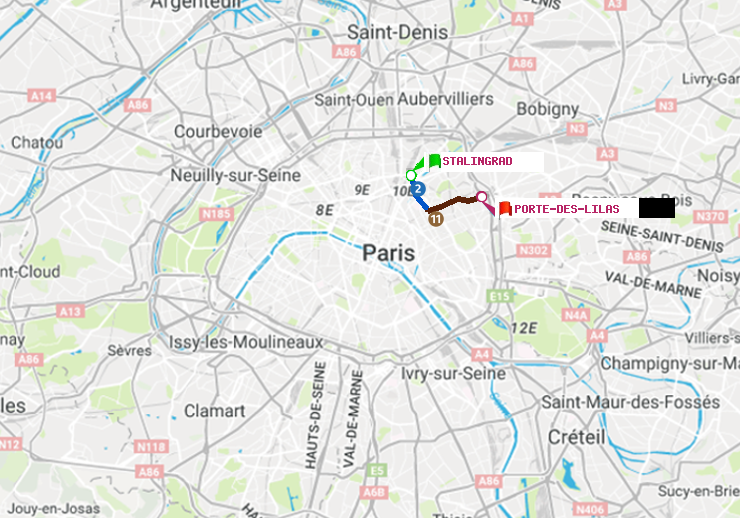 Il n'y a pas de ligne de métro directe entre les stations Stalingrad et Porte des Lilas. Le trajet est effectué avec une correspondances entre les lignes