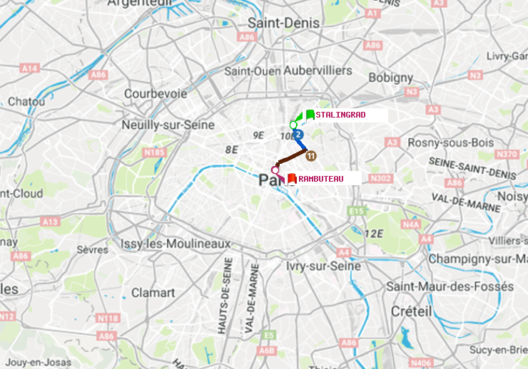 Il n'y a pas de ligne de métro directe entre les stations Stalingrad et Rambuteau. Le trajet est effectué avec une correspondances entre les lignes