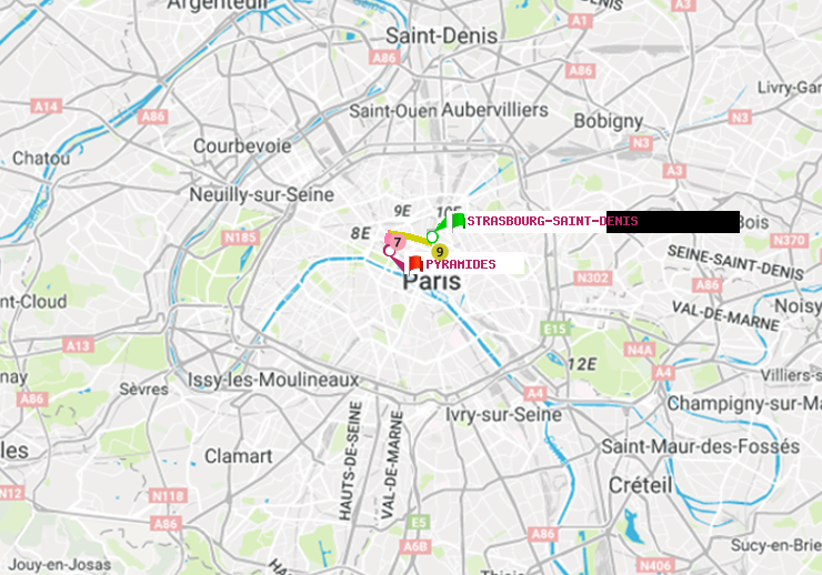 Itinéraire en métro parisien de Strasbourg-Saint-Denis vers Pyramides