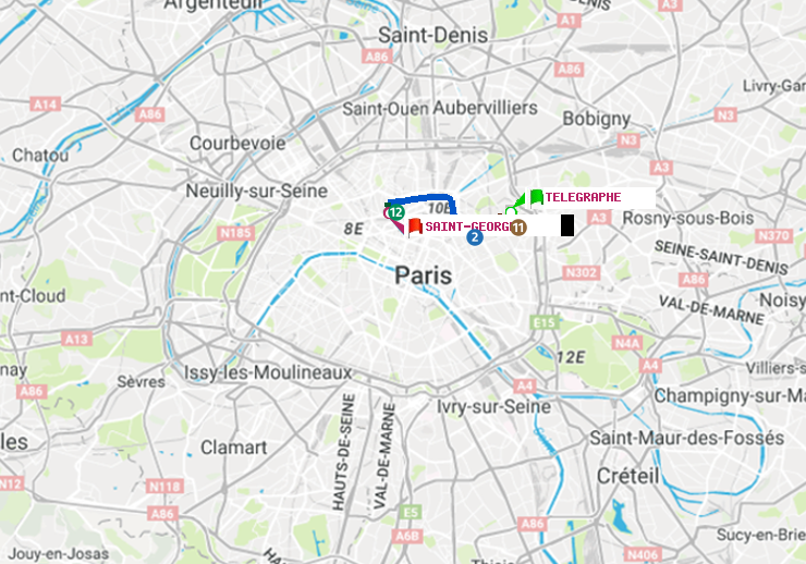 Il n'y a pas de ligne de métro directe entre les stations Telegraphe et Saint-Georges. Le trajet est effectué en 2 correspondances entre les lignes : ligne