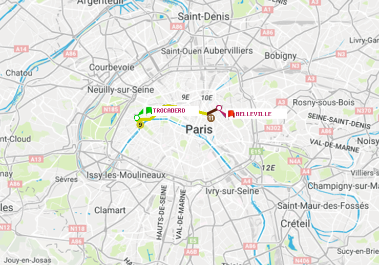 Itinéraire en métro parisien de Trocadéro vers Belleville
