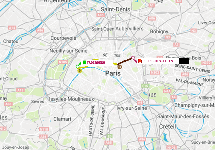 Il n'y a pas de ligne de métro directe entre les stations Trocadéro et Place des Fêtes. Le trajet est effectué avec une correspondances entre les lignes