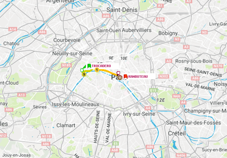 Il n'y a pas de ligne de métro directe entre les stations Trocadéro et Rambuteau. Le trajet est effectué en 2 correspondances entre les lignes : ligne