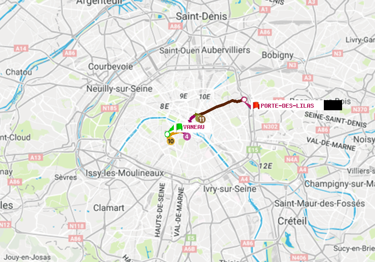 Plan de l'itinéraire métro de Vaneau vers Porte des Lilas