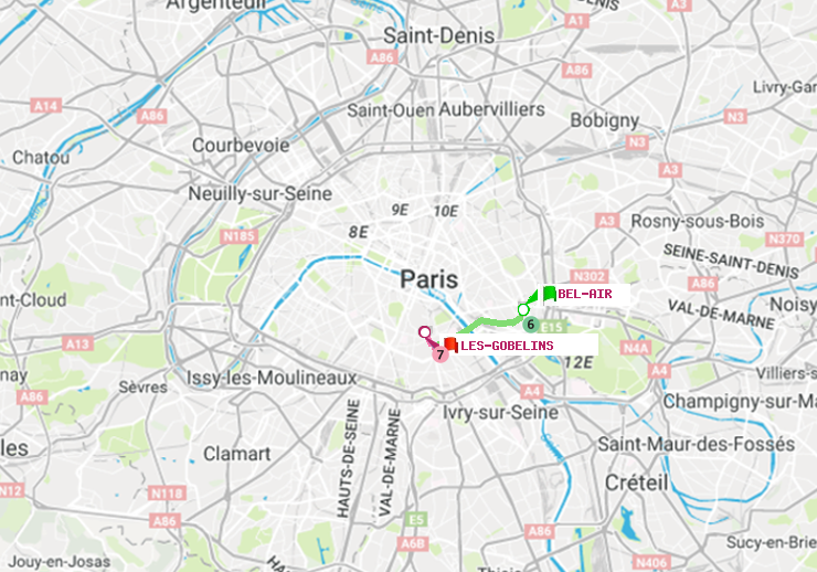 Il n'y a pas de ligne de métro directe entre les stations Bel-Air et Les Gobelins. Le trajet est effectué avec une correspondances entre les lignes