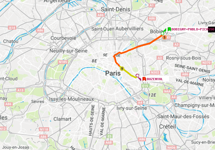 Il n'y a pas de ligne de métro directe entre les stations Bobigny-Pablo-Picasso et Buzenval. Le trajet est effectué avec une correspondances entre les lignes