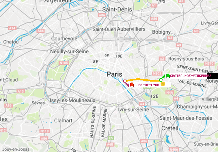Plan de l'itinéraire métro de Château de Vincennes vers Gare de Lyon
